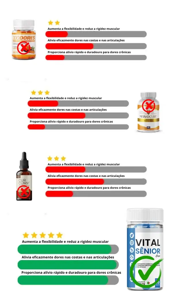 Fizemos testes em laboratório com o VITAL SÊNIOR para comparar sua eficácia em relação a outros produtos para dores que estão disponíveis no mercado brasileiro. Para isso, analisamos os 15 produtos mais vendidos e verificamos que NENHUM desses produtos contém como base a Vitamina D3, e os demais componentes extraídos em forma de óleo concentrado.
